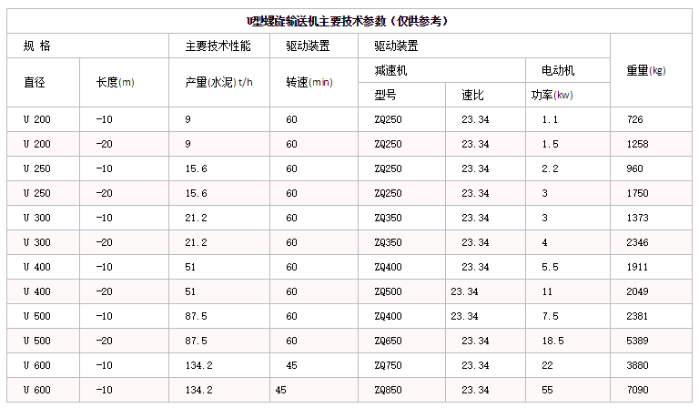 U型螺(luó)旋輸送機主要技術參數(僅供參考)