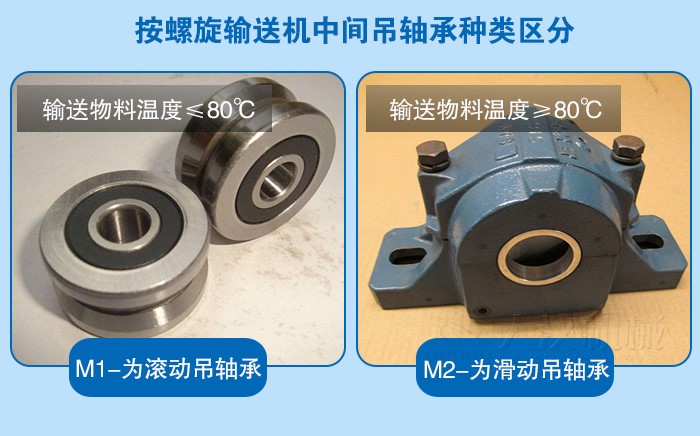1、M1-為滾動吊軸承,采用(yòng)80000型密封軸承,軸蓋上另有防塵密封結(jié)構(gòu),密封效果好,吊軸壽命長。(常用(yòng)在不(bú)易加油,不加油或(huò)油對物(wù)料有汙染的地方,輸送物(wù)料(liào)溫度≤80℃)