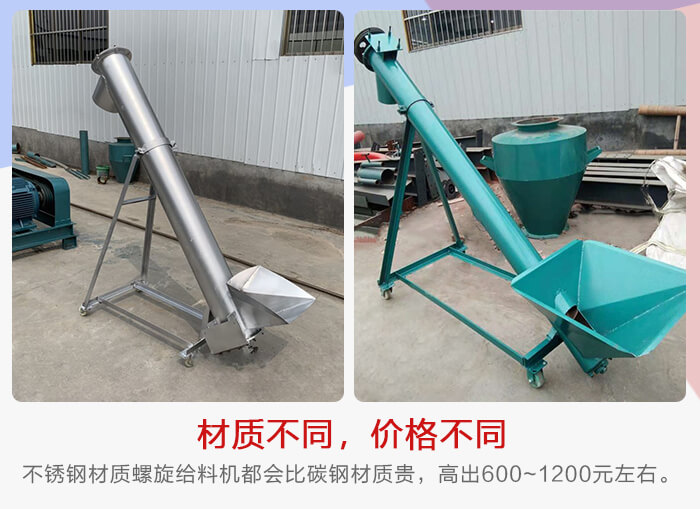 螺旋給料機可以分為碳鋼和不鏽(xiù)鋼(gāng)材質兩種,由於(yú)這兩者材(cái)質成本(běn)有差異(yì),碳鋼螺旋給料(liào)機適合普通物料輸送(sòng),不鏽鋼螺旋給料機主要用於輸送機一些腐蝕性、高溫物料(liào),也用於食品、醫藥等對輸送環(huán)境有衛生標準的行(háng)業,所以不鏽鋼材質螺旋給料機都會比碳鋼材質貴,一般會高出600~1200元左右。