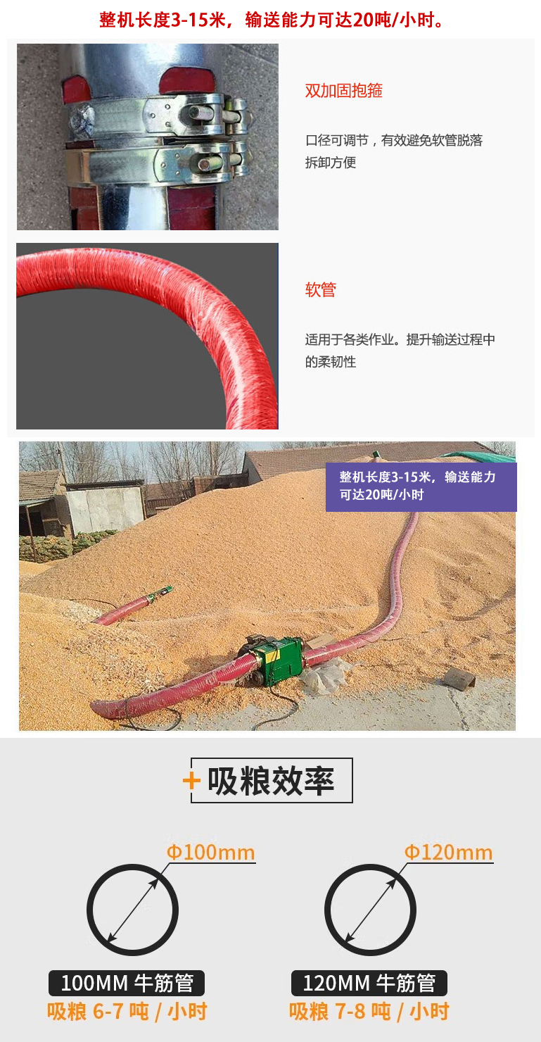 簡介:吸糧機(jī)是一種通過管(guǎn)道輸送散糧的設備。它的主要功能是將穀物從一(yī)個設備運輸到另一個設備(bèi)。常見的是把地上的散糧運到卡車上,卡車(chē)上的散糧運到糧庫,體積小、攜帶方便。