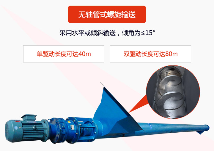 無軸管式螺旋輸送機也叫管式無軸螺旋輸送機,其外形為圓管式,可水平或傾斜輸送,其傾角為≤15°,有雙驅動和(hé)單驅動之分,單驅動螺旋機長度(dù)可(kě)達40m,雙驅動螺旋(xuán)機采用中間斷(duàn)開軸(zhóu)結構,長(zhǎng)度可達80m。由於采用(yòng)了無軸設計,可輸送粘性強、易纏繞的物料(liào),物料不易堵塞,排料口不堵塞。