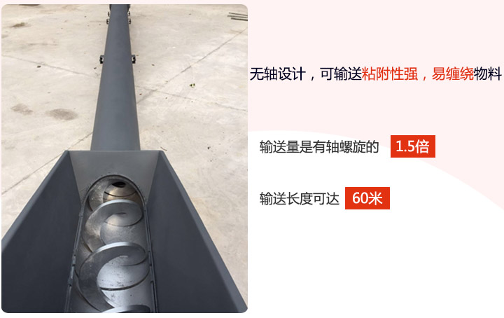 2、輸送量是相同直徑傳統有軸螺旋輸送(sòng)機的1.5倍(bèi),單機輸送長度可達60米。