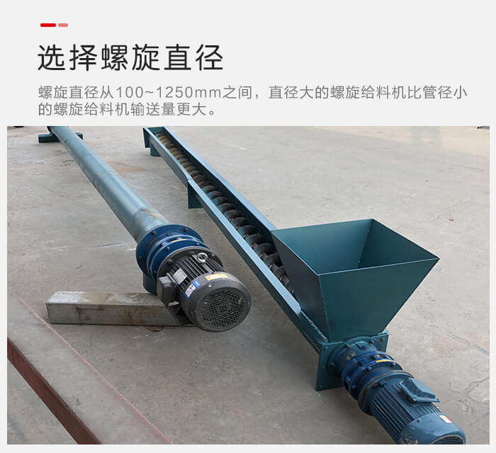 螺旋給料機螺旋直徑從100~1250mm之間,選擇不同的管徑對於單位時間輸送(sòng)量是有直接的影響的(de),直徑大的螺旋給料機比管徑小的螺旋(xuán)給料機輸送量更大。