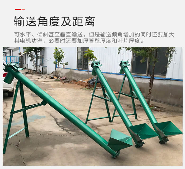 螺旋給料機可以水平、傾斜甚至垂(chuí)直(zhí)輸送,但是輸送(sòng)傾角增加的同時還要加大其電機功率,必(bì)要時還要加厚管壁厚度(dù)和葉片厚度。