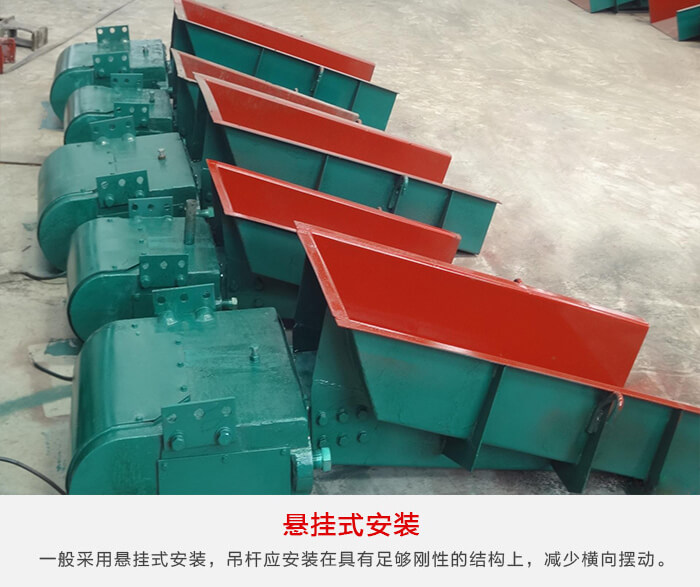電(diàn)磁(cí)振動給料機一般采用懸掛式安(ān)裝,吊杆應(yīng)安裝在具有足(zú)夠剛性的結構上, 為了減少電磁振動給料機的橫向擺動, 懸掛吊杆應向外張開 10°左右布置。對於大(dà)型給料機, 為了維修和更換料槽方便,還應設置移動滑架。