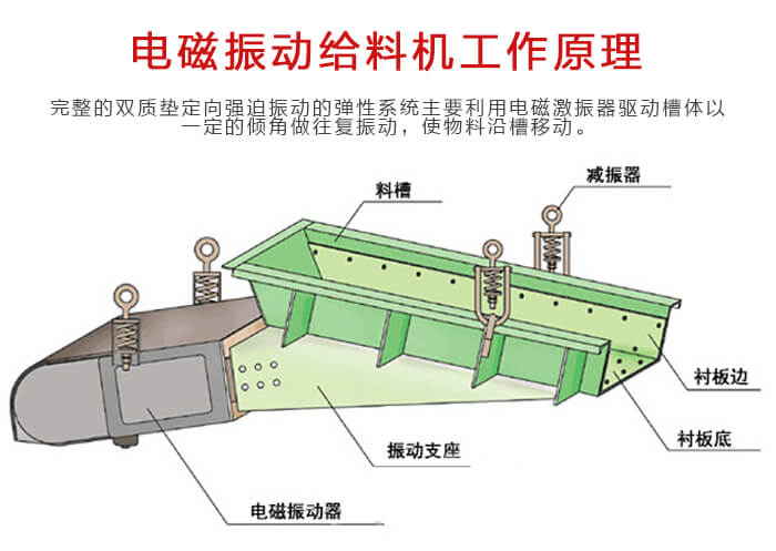 電磁振動給(gěi)料機是一個較為完整的雙質墊定向強(qiáng)迫振動(dòng)的彈性係統, 整個係統工作在低臨界(jiè)共振狀態,主要利用電磁激振器驅動槽體以一定的傾角做往複振(zhèn)動,使物料沿槽移(yí)動。