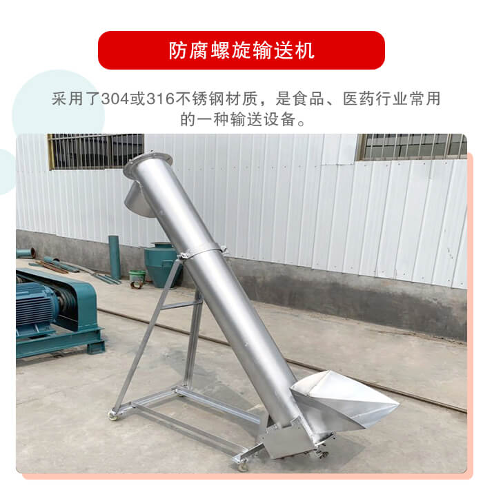 防腐螺旋(xuán)輸送機采(cǎi)用了304或316不鏽鋼材質,是食品、醫藥行(háng)業常用的一種輸送設備,今天小編就(jiù)來為大家(jiā)介紹一下(xià)防腐(fǔ)螺旋輸送機的(de)特點及適用範圍: