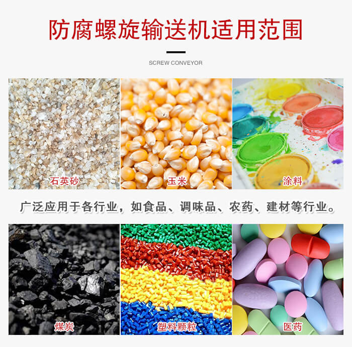 防腐螺旋輸送機廣泛應用於各(gè)行(háng)業,如食(shí)品、調味品、農藥、獸藥、建材(cái)、化工(gōng)、電力、冶金(jīn)、煤礦(kuàng)炭(tàn)、糧食(shí)等行業,適用於水平或傾斜輸送粉狀、粒狀和小塊狀物料,尤其適合食品、醫藥行業,滿足行業衛生(shēng)標準,可輸送諸如麵粉、飼料、花椒粉、藥粉等物料。