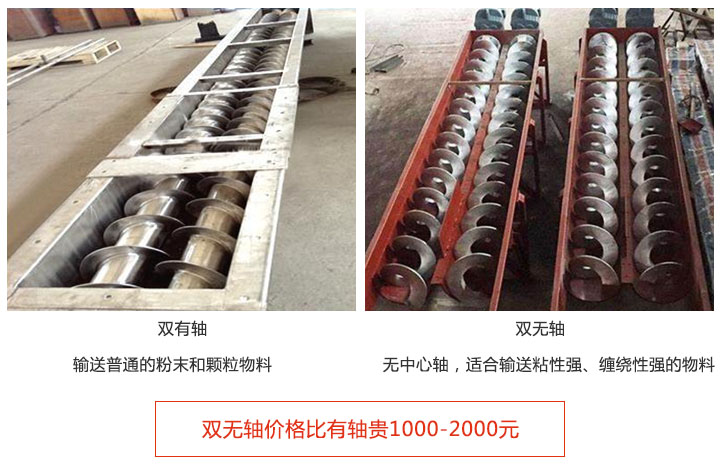 注:雙無軸螺旋輸送機價格比有軸貴1000-2000元,因為采用無軸(zhóu)設計,可解決(jué)易纏繞物料的輸送,且設計難度比有軸大。
