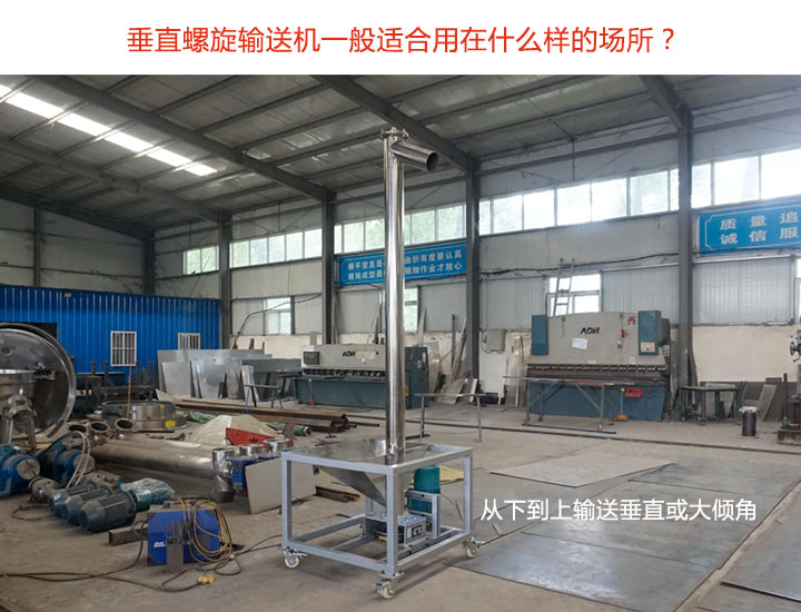 垂直螺(luó)旋輸送(sòng)機使用場所一般為(wéi)食品、冶金、煤炭、建材、水泥廠、飼料廠、糧食、醫藥、等(děng)行業需要垂直提升物(wù)料時可選擇;也適合不固(gù)定需要移動的場所(suǒ)作業,選擇移動式垂直螺旋輸送機(底部加萬向輪),常用於占地麵積有限製的輸送場所(suǒ)。
