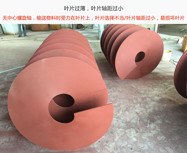 葉片軸距過小:螺旋槽體(tǐ)選擇不當,輸送物料的時葉片軸距過小,會造成擠壓力過(guò)大,損傷葉片;若槽體較小,同樣也會造成壓力過大,導致葉片損害。