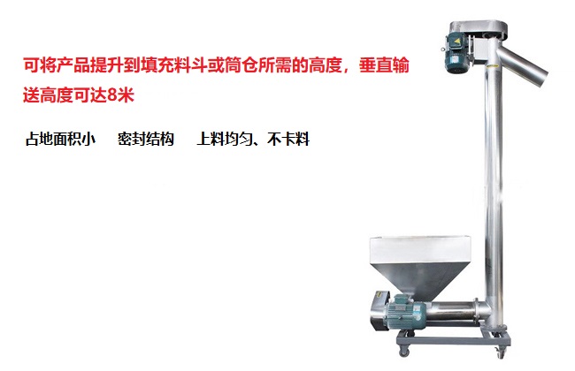 物料隨螺旋(xuán)高速(sù)旋轉,被輸送的物料從水(shuǐ)平(píng)部分的進料口加(jiā)入,通過旋轉的水平進(jìn)料螺杆送入輸送機和垂直部分,然後將(jiāng)物料向(xiàng)上推(tuī)至出料口出料口由垂直螺杆,物(wù)料隨螺杆高(gāo)速旋轉,被輸送的物料從水平部分的進料口(kǒu)加入,通過旋(xuán)轉的水平進料螺杆進入輸送機,然(rán)後用垂直螺旋將物料推到出料口排出。