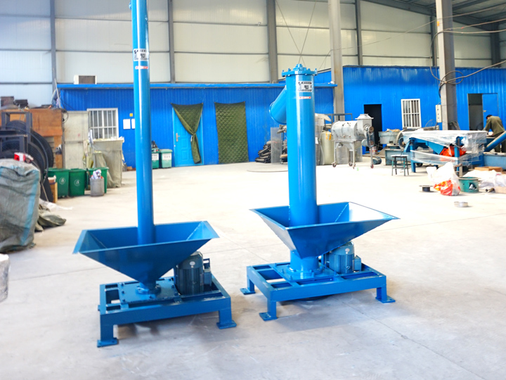 垂直螺旋輸(shū)送機(jī)的進料必須保持必要的進料(liào)力。當進料高度差較小時,垂直螺旋輸送機裝有水平進(jìn)料螺旋。一(yī)般水平(píng)進(jìn)料螺旋和垂直(zhí)輸送螺旋做成一個整(zhěng)體。水平進料螺旋的直徑與垂直進料螺旋的直徑相同,水平進料螺旋的轉速低於垂直進料(liào)螺旋的轉速。