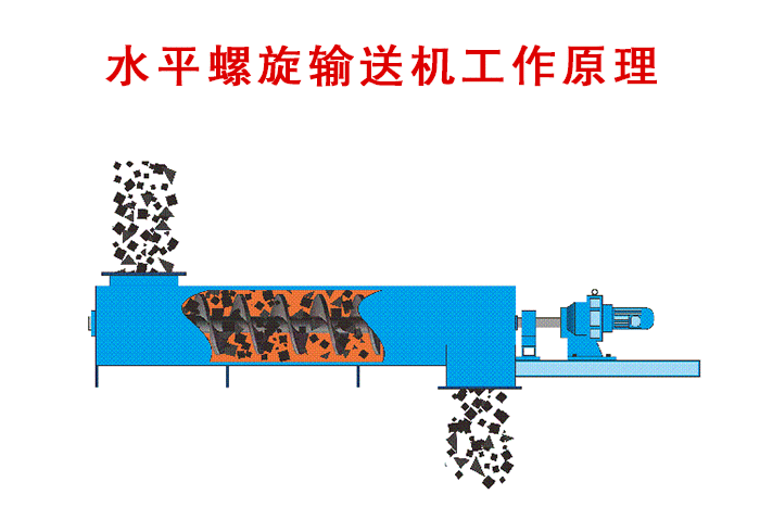 當物料加(jiā)入固定料槽時,由於物料自重和機槽之間的摩擦,會堆積在機(jī)槽上,物料在旋轉的螺旋葉片的推動下向前運動,從而達到水平方向上的輸送的。
