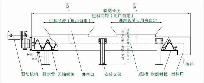 以上是對水平螺旋輸送機結(jié)構及工作原理的介紹,水(shuǐ)平螺旋輸(shū)送機有:200、250、300、400、500、600等型號(hào),用於粉(fěn)狀/顆粒狀/小塊狀物料(liào)的小型(xíng)、短距離輸送,可根據要求(qiú)選擇單點加料、單點卸料、多點加料、多點(diǎn)卸料。