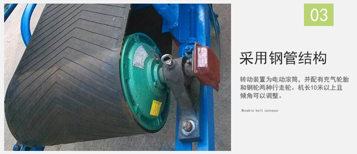 采用鋼管結構,輕巧美觀,機動性好(hǎo)。轉動裝置為電動滾筒,並配有充氣輪胎和鋼輪兩種行走輪。機長10米以上且傾角可以(yǐ)調整。