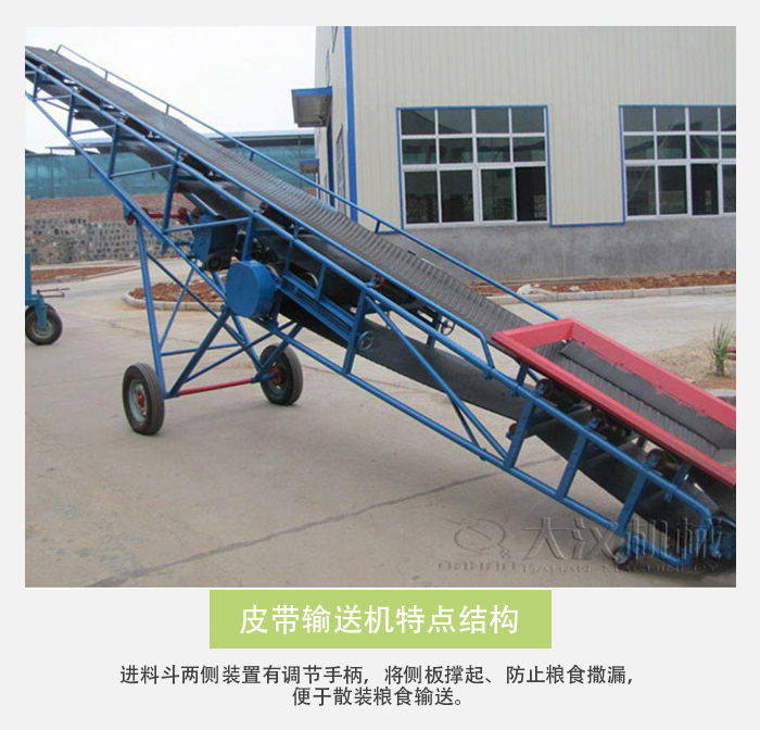 在可移動式皮帶輸送機機架兩旁裝有旁導管,防止糧包在輸送時掉(diào)包,並在進料(liào)鬥兩側裝置有調節手柄,將側板撐起、防止糧食(shí)撒(sā)漏,便於散裝糧食輸送。大(dà)、小(xiǎo)走輪均采用實心膠輪,防止壓碎糧食和倉庫地麵。