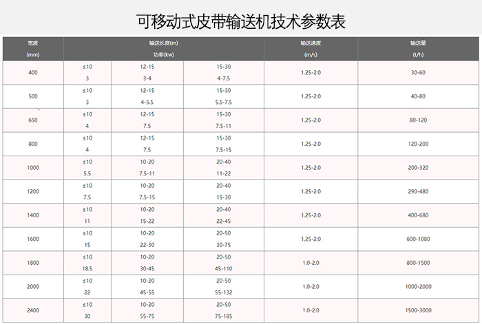 可(kě)移動式(shì)皮帶輸送機具有快、慢兩種速度(dù)、以適應散運、包裝的不同要求,提高了設備的(de)利用,發揮了一機(jī)多用的性能。移動式皮帶輸送機有電動、手動升降兩種(zhǒng)型式有5米(mǐ)、8米、10米、12米、15米、18米、20米(mǐ)等規格。