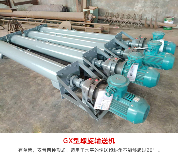 GX型螺旋輸(shū)送機有單管,雙管兩種(zhǒng)形式,適(shì)用於水平的(de)輸送傾斜角不能夠超過20°。可輸送一些(xiē)塊狀的(小(xiǎo)塊狀物料)例如:麥子,玉米,黃豆等糧食。