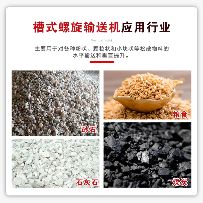 槽式螺旋輸送機是農業各部門]機械化運輸工作的主要機組,可(kě)使運輸工作減輕勞動強度,提高(gāo)工作效率(lǜ),應用範圍很廣。槽式螺旋輸(shū)送機適用於各行業,如(rú)建材、化工、電力(lì)、冶金、煤炭、糧食等行業,適用於水平(píng)或(huò)傾斜輸送粉狀、粒狀和小(xiǎo)塊狀物料,如煤、灰、渣、水泥、糧食等。