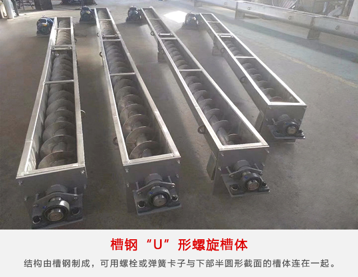 槽鋼“U”形螺旋槽體適用於輸送機支承間(jiān)距要求長(zhǎng)的場合。槽體的上邊(biān)由結構槽鋼製成,可用螺栓或彈簧卡子與下部半圓形截麵的槽體連在一起。