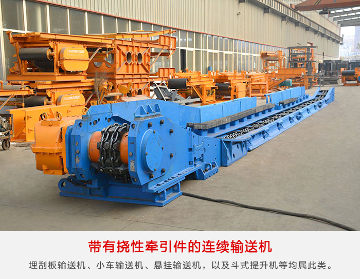 帶式輸送機、鏈(liàn)板輸送機、刮板輸送機、埋刮板輸送機、小車輸送機、懸(xuán)掛輸送機,以及鬥式提升機等均(jun1)屬此類。其工作特點是把(bǎ)物品置(zhì)於(yú)承載件上,由撓性牽(qiān)引件搬運承載(zǎi)件沿著固定的(de)線路運動,靠物品和承載件的摩擦力使物品與牽引件在工作區(qū)段上一起移動。